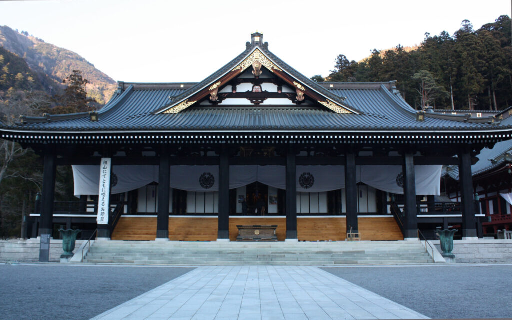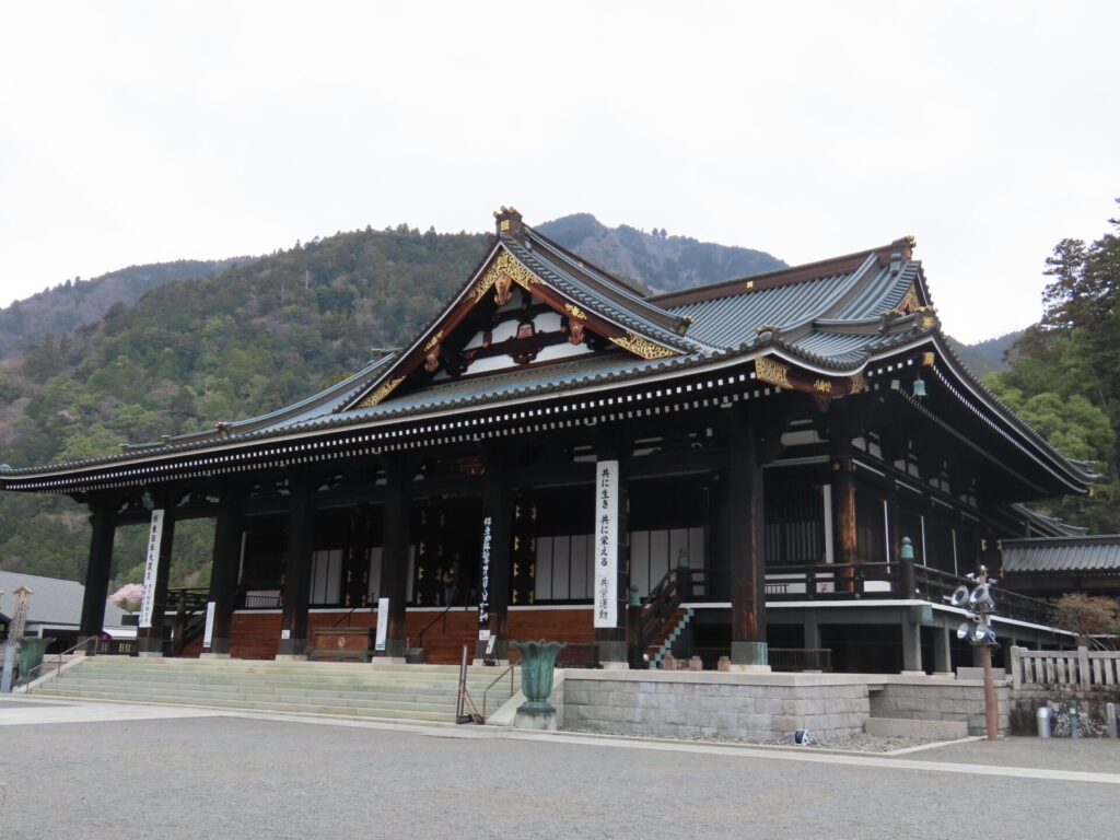 間口17間半奥行28間。総坪数970坪で日蓮宗最大級の堂宇。90世岩間勇上人代の昭和60年に日蓮聖人700遠忌記念事業の一環として落慶。正面に祀られる仏像は、日蓮聖人が筆で書かれた大曼荼羅(まんだら)本尊を仏像で表現したもので、須弥檀(しゅみだん)歓請の諸尊・一塔両尊四士等の15体は江里宗平(えり そうへい)仏師の作、祖師像は沢田政廣(せいこう)仏師の作となっています。外陣天井は、加山又造画伯筆の9メートル四方の墨龍が荘厳。